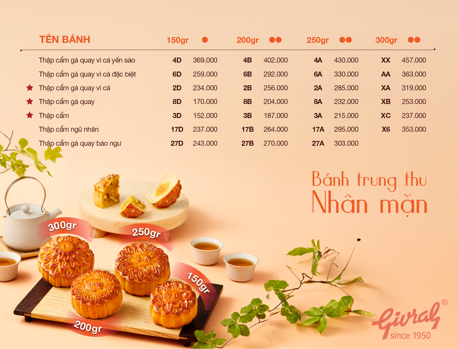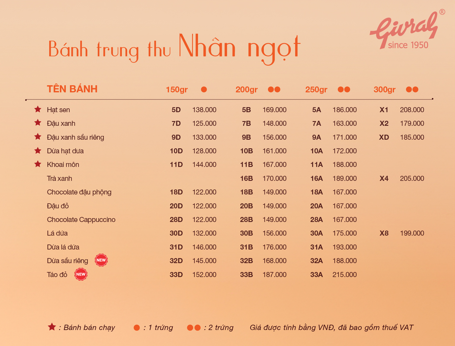 Trân trọng gởi đến quý khách hàng bảng giá bánh trung thu Givral năm 2024. Bảng giá chưa bao gồm chiết khấu. Vui lòng liên hệ