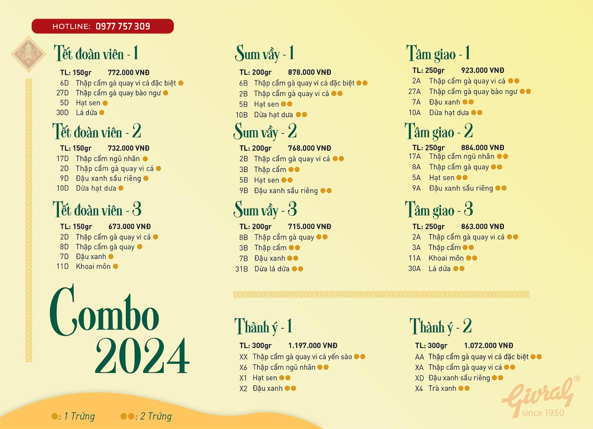 Ngoài những chiếc bánh lẻ được bán như ở bảng giá thì hãng còn mang đến quý khách những hộp combo bánh trung thu của Givral nhiều loại với các mức giá khác nhau từ trung đến cao cấp. Mỗi một combo được đặt 1 cái tên ý nghĩa khác nhau, thay cho những lời chúc tốt đẹp nhất được gửi đến người nhận.